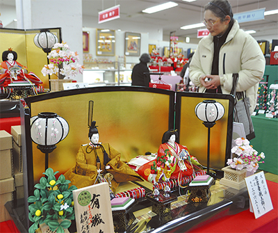 ひな人形を品定めしていた市内在住の女性は、「鹿児島にいる娘に去年女の子が生まれたので、贈ろうと思って見に来ました。どの人形もきれいで目移りしちゃいます」と笑顔で語っていた。