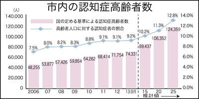 高齢化とともに、認知症患者数も増加しており、国が定める基準に沿った認知症高齢者の人数は、13年9月末時点で約7万4千人。こちらも2025年には約12万4千人になると推計されている。
