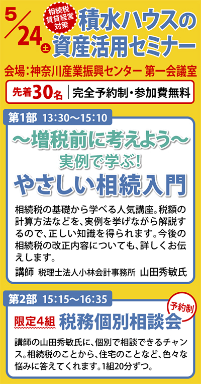 5月24日(土)、午後1時半から、積水ハウス(株)横浜北支店が主催する「資産活用セミナー」が開催される。