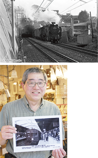 今回展示された写真の中でも特に貴重な1枚は、山手駅の根岸方トンネルから出てくるD51形蒸気機関車=写真上。竹中さんによれば1970年2月13日、洋光台延伸開業前に線路の砂利を踏み固めるために、重量のある蒸気機関車を走らせたのだという。「開通後の根岸線上に蒸気機関車が走ったのはこの時だけ」と竹中さん。また、石川町駅のホームから当時あった遊技場が見える写真など「鉄道だけでなく、周りの風景も含めて楽しめる写真を選んだ」と話し、1枚ずつ鉄道の説明や当時の思い出など、竹中さんのコメントが書き添えられている。