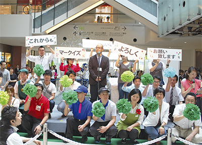 マークイズみなとみらいが開業1周年を迎えた6月21日、午前10時の開店とともに、各店舗の店長約60人と着ぐるみキャラクター16体が勢ぞろいし、1階広場で来館者を出迎えた=写真。