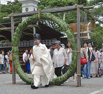 今年は2回に分けて行われ、600人が参加。神事では神職に続いて参加者たちが真剣な面持ちで大祓詞を読み上げ、人の形をした和紙で体をさすり、半年間のけがれを紙に移し、切麻で清めた。その後、神職に続いて直径2メートル以上の茅の輪を3回くぐり、無病息災を祈った。