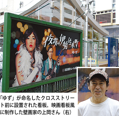 青江さんの看板と同じ、映画看板風の「手描き」にもこだわった。制作したのは壁画家の上岡高廣さん(51)。元映画看板職人で青江さんの看板のほか、以前横浜松坂屋にあった「ゆずの路上ライブ時代の壁画」も手掛けている。原画に忠実な作品は2日で仕上げた。続々と訪れるファンを見ながら「またゆずを描く機会を与えてもらえて光栄」と笑顔の上岡さん。青江さんの看板は6代目を企画中で、ゆずの看板が撤去された後に設置予定だという。