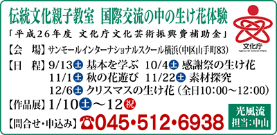横浜いけばな光風流では「平成26年度文化庁文化芸術振興費補助金」事業として「国際交流の中の親子生け花体験教室」を行う。9月13日から全5回。対象は小学1年から中学3年までの子どもと保護者。参加費は全5回で5千円(材料費)。