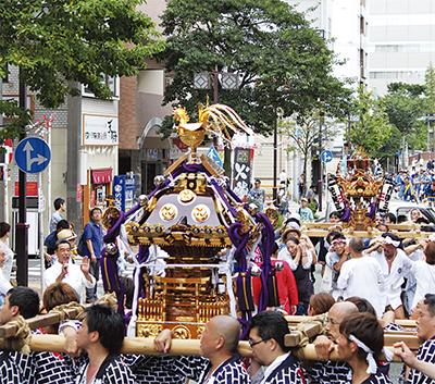 伊勢山皇大神宮に祀られている「子之大神(ねのおおかみ)」の2年に一度の本祭にあたる「例祭連合神輿渡御」が8月24日に執り行われ、7町会の神輿が境内から出発して野毛地区を練り歩いた。担ぎ手たちは揃いのはっぴを身にまとい、威勢良い掛け声を響かせ、最終的には野毛本通りに集結し、執り納められた。
