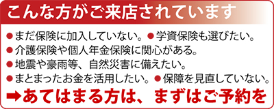 生命保険のほか、医療・火災(地震)・自動車・積立の為の保険などの相談・手続きがまとめてでき、何度でも無料で相談できる。