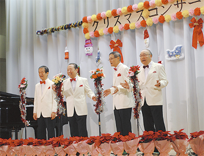 地区社協の米岡美智枝会長やスタッフ、地域のボランティアら100人以上が手作りで開催するコンサート。当日は地域住民300人以上が来場。横浜で活動する男声合唱団「ハーバーカルテット」=写真=や、前西区職員の梅澤厚也さんが歌謡曲やクリスマスソングなどを歌い上げ、会場から大きな拍手が沸いていた。
