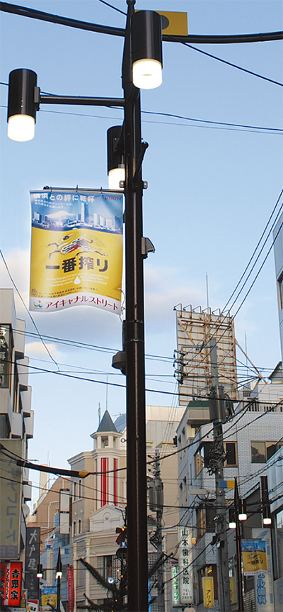 横浜市の社会実験として先月21日から3月中旬まで、石川商店街の街路灯に「キリン一番搾り」のフラッグ広告が掲出されている。