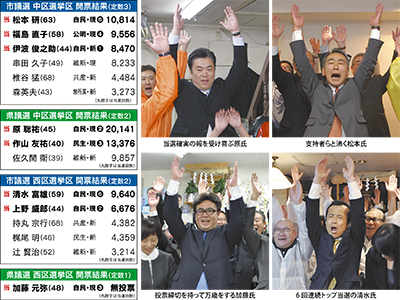 自民現職の原聡祐氏が前回に続きトップ当選、3期目を決めた民主の作山友祐氏に6765票の差をつけた。原氏は「前回を上回る大変多くの負託をいただいた。2期目、県政の場でこの負託をしっかり活かせるように働きたい。身の引き締まる思い」と話した。