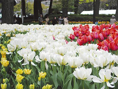 春の訪れを告げる中区の風物詩、横浜公園のチューリップが見頃を迎えている。先週末には「チューリップまつり」が開催され、多くの来園者で賑わった。