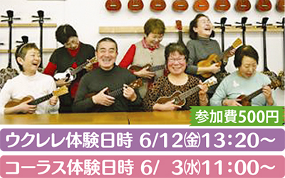 中高年のための「S&S音楽教室」で初心者向け体験レッスンが行われる。小さくて音色がかわいいウクレレは女性に大人気。
