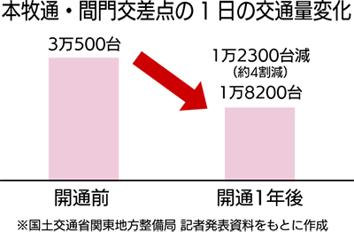 道路開通前には最大渋滞長が310mあったが、開通6カ月後には20mとほぼ解消。また1日約7500台あった大型車の交通量が約4500台に減少したことで、生活環境の改善にもつながっている。