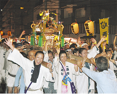 5日、祭りの最後を飾ったのは毎年恒例の町内連合神輿の宮入り。70店以上の露店が並び、見物客で賑わう参道を平沼小5、6年生の神輿を先頭に10町内会の神輿が「わっしょい、わっしょい」という掛け声とともに神社を目指し、練り歩いた。