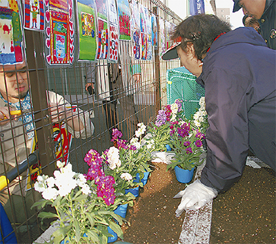 当日は、初黄町内会をはじめNPO法人黄金町エリアマネジメントセンター、区役所、土木事務所、伊勢佐木警察署が協力、運ばれてきた4つのプランターにパンジーやビオラ、マーガレットなど5種類の花が植えられた。