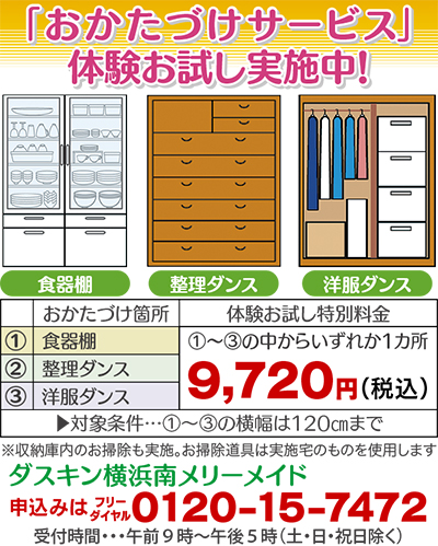 「どう片付けて良いのかわからない」、「食器や衣類の数が多くて取り出しにくい」など、整理・収納方法に悩んでいる人に朗報。家事代行のプロ「ダスキン横浜南メリーメイド」では、ミセスの間で話題の「おかたづけサービス」を体験お試し料金で実施している。