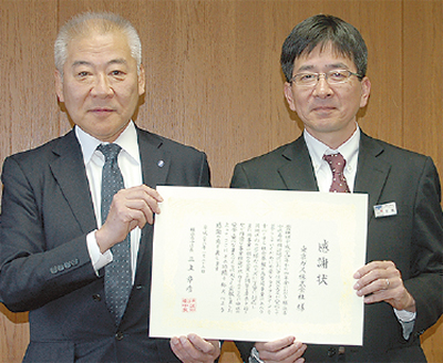 東京ガス株式会社は、中区寿町周辺地区の再整備を円滑に進める上で大きな役割を担ったとして1月25日、中区から感謝状が贈られた。当日は、同社神奈川導管ネットワークセンターの安藤広和所長をはじめ同整備に関わった社員が出席。出迎えた三上章彦中区長は「東京ガスの貢献は大変大きい」と感謝の意を示した。