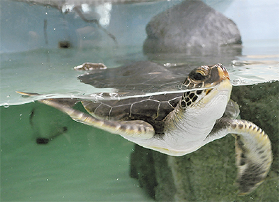 間門小学校に2月8日、アオウミガメがやってきた。