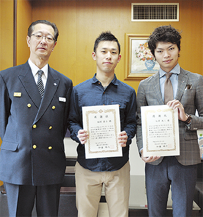 表彰されたのは、戸塚区在住の会社員、本間喬士さん(30)=写真中央=と保土ケ谷区在住の学生、七澤洸二さん(21)=同右。