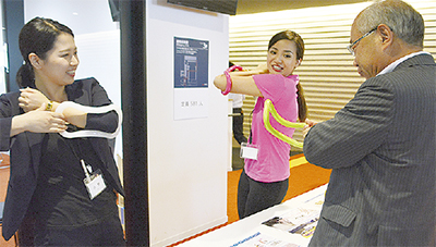 6月10日に南公会堂で行われた同社の安全推進大会には、エイムの専用ブースが設置。スタッフがフィットネス器具の使用方法を馬淵建設の社員に説明する場面もあった。日ノ出町駅前再開発に共同事業で関わった両社は今後もPR活動を進めていく方針だ。