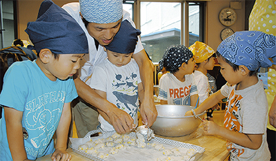 西区東久保町のトキワ保育園(檀原文子園長)で6月28日、園児たちがさつま揚げ作りに挑戦した。
