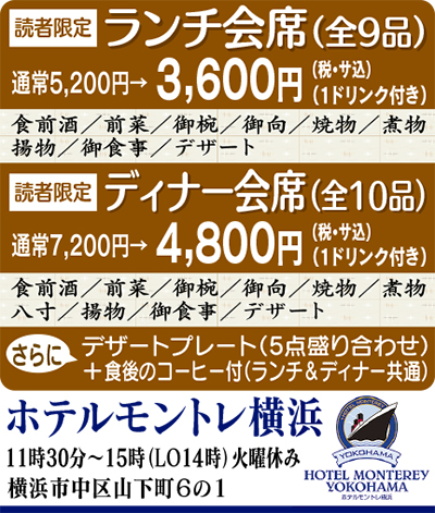 タウン読者限定でアルコールも選べるワンドリンクと食後のデザート盛合せ、珈琲付き。夏休みの会食や各種お祝いなど週末予約はお早めに。個室(有料)有。 必ず「タウン見た」と予約の上、記事持参で来店(1枚でグループ全員適用・他サービスとの併用不可・10月31日(月)まで・中区西区)。【電話】045・661・8022