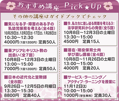 会場は金沢八景キャンパス、金沢文庫キャンパス、横浜メディア・ビジネスセンター8階KGU関内メディアセンターの3カ所。現在、希望者に全講座内容を掲載したガイドブックを無料で進呈。■申し込み=同大学社会連携センター【電話】045・786・7892(平日のみ)
