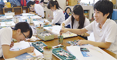 5月に制作を引き受け、約1カ月の話し合いの末、会場に多く訪れる外国人観光客を歓迎したいという思いから「日本の四季」をテーマにした壁画をデザインすることに。20人の部員がA、B、C班の3つに分かれ、計5つの壁画を分担して制作する。A班が担当する横幅35m、高さ2・7mの壁画は、10枚の原画を描き、それらを拡大スキャンして制作。壁画は全て合わせると横幅約66mで、入学式やひまわり、焼き芋、雪だるまなど、季節ごとの行事や食べ物、植物を描く。