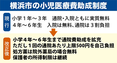 現行の横浜市の制度では患者負担分を市や県が負担することで、0歳から小学3年生までは通院・入院ともに実質無料、小学4年から6年生までは入院費は無料だが、通院費は大人と同じ3割負担となっている。