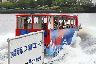 16年8月10日にプレオープンを迎え、このたびチケット受付所・待合所、赤レンガパークから出発するコースを開設し、グランドオープン。式典でシティアクセス株式会社代表取締役社長の藤木幸二氏は「待ちに待った日がやっと来た。横浜を訪れた人に来てよかったと言ってもらえる事業にできれば」と抱負を語った。式典後、バスは42人の乗客を乗せ、日本丸メモリアルパーク前から出発。乗客らは水辺からの景観を楽しんだ。