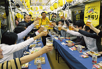 平日夜に走行する電車内でビールを楽しむイベントを開催するのは、京急電鉄では初めての取り組み。参加費3千円、先着80人の同イベントは、申込開始直後に定員満了になる人気ぶりだった。