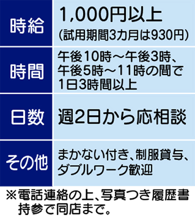 同店はこだわりのワンタンスープを専門に取り扱う店舗。仕事内容は簡単な調理補助・接客・洗い場担当など。30代から60代まで、幅広い年齢層のスタッフが在籍。未経験者も大歓迎だ。「和気あいあいとした職場です。気軽にご連絡下さい」と店長の安濃俊一さん。