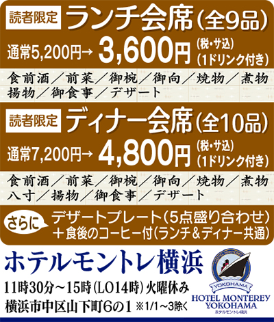 ホテルモントレ横浜の日本料理「隨縁亭(ずいえんてい)」では、昼・夜共にタウン限定の会席が大人気。落ち着いた雰囲気の店内で料理長こだわりの旬のメニューの数々が味わえるため、新年会や各種お祝いでの利用もおすすめ。
