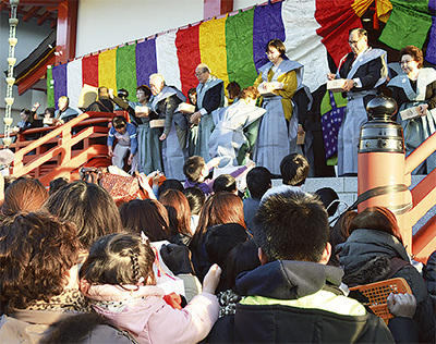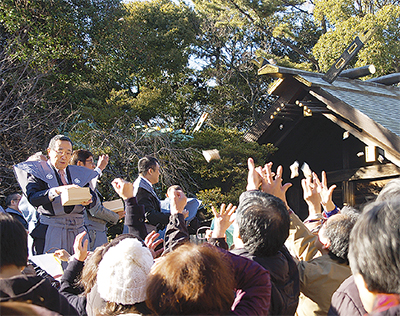 横浜の総鎮守・伊勢山皇大神宮(池田正宏宮司)では、節分会の藤木幸夫会長をはじめ、かみしも姿の年男・年女たちが参列。神事の後に、境内の特設舞台からまかれた豆が、晴れ渡った空に飛び交った。日ノ出町・子神社の豆まきでは、「こっちー」と叫ぶ地域の子どもたちの声が境内に響き渡っていた。