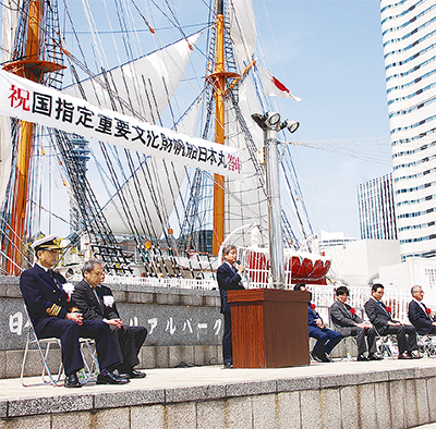 今年最初の総帆展帆の日となった4月16日、帆船日本丸の国指定重要文化財答申を記念した式典が同メモリアルパークで行われた。