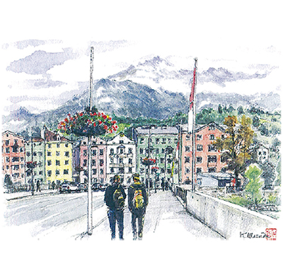 作品はすべて水彩。益田さんがオーストリア各地を巡りウィーンにいたる昨年秋の旅で描いたもの。写真の作品は「イン川沿いの家並み(インスブルック)」。