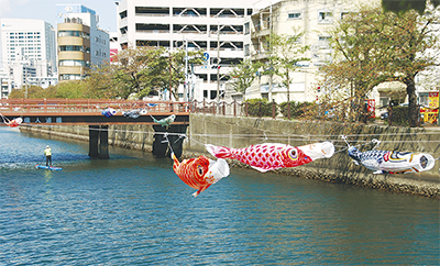 子どもの健やかな成長を祈念して日ノ出町青年会が15年ほど前から実施しているもので、今年は5月7日まで。長者橋から末吉橋にかけて、10カ所に6匹ずつ、計60匹の鯉のぼりが飾られている。