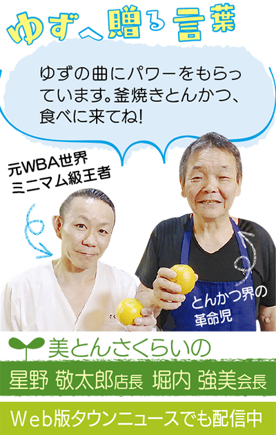 「オンリーワンのとんかつを横浜から発信したい」と並々ならぬ熱意を語るのは、美とんさくらいの会長、堀内強美さん。全国からくるゆずっこ(ファン)をわが子のように温かくもてなし、ついたあだ名は「横浜のお父さん」。ゆずが好きなのはもちろん、はるばる岡村まで来てくれるゆずっこの気持ちが嬉しいのだとか。今では元気な姿で店に立つが、数年前に余命告知を受けるほどの大病を患ったことも。多くの人の応援歌になっている『栄光の架橋』は自身にとっても、特別な一曲だという。