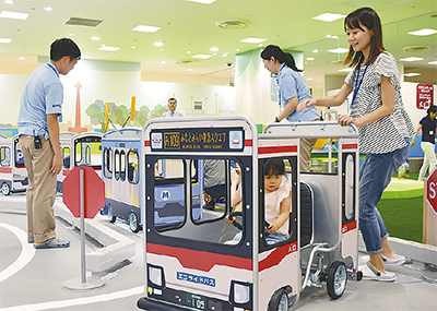 その他、最新のCGと立体音響技術を用いた屋内砂浜や水なしでも固まる安全性の高い砂で遊べるコーナーなど、親子で楽しめるコーナーが満載。担当者は「電鉄会社と組むことで地域色が出る。今後も各地域の鉄道とコラボレーションできれば」と期待する。