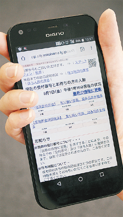 該当するのは、庁舎1階の戸籍課と保険年金課。来庁者が混雑時間を避けたり、待ち時間の見通しが分かるようにと導入された。同様のシステムは鶴見区(昨年4月〜)など、市内7区で始まっている。