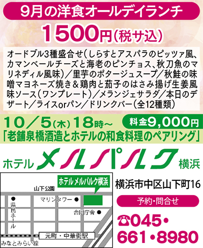 山下公園沿い、ホテルメルパルク横浜1Fレストランの和洋中ランチが好評だ。メニューは季節感を大切にした月替わりで、毎月楽しみにしているリピーターも多い。