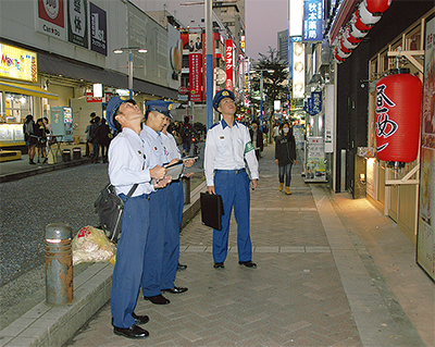西区南幸1・2丁目の商業ビル39棟、148テナントを訪問。避難通路の確保や避難階段、防火戸の状況など防火設備が適切に維持管理されているかをチェックした。