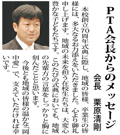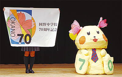 2部では、在校生が作成した70周年のスローガンとシンボルマーク、美術部が作成したマスコット「オカちゅう」が披露された。