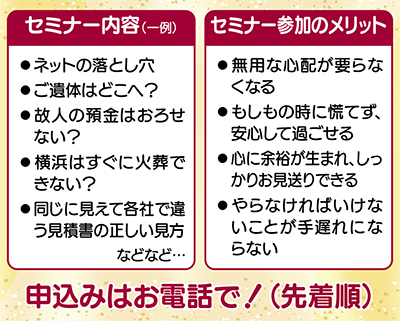 「葬儀のことなんて考えられない」「特に準備はしていない」という人に、「生前にこれだけは知っておいてほしい」という内容を集めたセミナーが12月9日(土)午前10時から開催される。会場は西区のラステル久保山。参加無料、予約制。