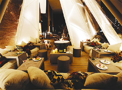 冬は5種から選べる熱々のキャセロール料理や、3種のサラダ&ブレッドビュッフェを提供。お洒落なアウトドアグッズと共にバスケットに詰めて、ラウンジやテントの中で揺れる炎を見ながらゆったり食事ができる。メイソンジャーのデザートと飲物は絶景の屋上など、館内の好きな場所で楽しめる。大人3500円。