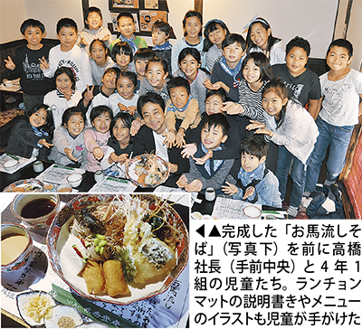 本牧の伝統行事をPRするため、間門小学校4年1組の児童と地元のそば店「味奈登庵(みなとあん)」((株)タカシン=中区小港町=)が共同開発していた新メニュー「お馬流しそば」が完成した。12月8日から中区山下町の総本店、本牧店など一部店舗で販売される。