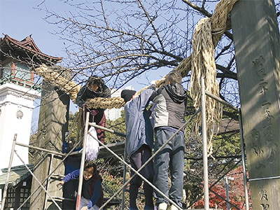 横浜の総鎮守・伊勢山皇大神宮(池田正宏宮司)で12月2日、「注連柱(しめばしら)」の大しめ縄掛けかえが行われた。新年を迎える準備として毎年この時期に行われる恒例行事。
