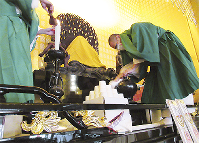 西区宮崎町の横浜成田山で12月13日、日ごろの護摩焚きによってついたすすを払い落す「お身拭い」が行われた。昨年5月建立の新本堂で2度目の正月準備となる。