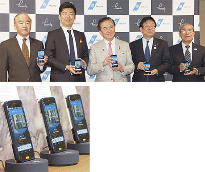 ホテルなどに導入が進む客室スマートフォン「handy」。このほど、外国人観光客向けに無料で貸し出す実証実験が横浜・鎌倉・箱根の3エリア、5カ所の観光案内所で2月中旬から実施される。各60台、計300台を設置。3月末まで。県と同スマホを提供する「handy Japan」(勝瀬博則社長)=東京都港区=が1月30日に県庁で協定を締結した。