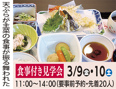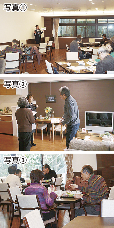またもう一つの特長、料理長が腕をふるう食堂の料理にも舌鼓を打ち、旬の食材を使い、健康面に配慮した献立に大満足といった様子=写真【3】=。さらに、気になる入居費用の事や、既に入居している人の日常や生活ぶりに関しての質問をする姿も多く見られるなど、同所での暮らしについて理解を深めていた。