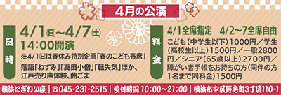 毎月1日から7日に行われる「横浜にぎわい寄席」。その初日となる4月1日(日)は、子どもから大人まで楽しめる演目を取りそろえた「こども寄席」が開催される。午後2時開演。落語「名工 左甚五郎 ねずみ」「真田小僧」「転失気」などを披露。同館では「ご家族皆さまでお出かけください」と来場を呼びかけている。